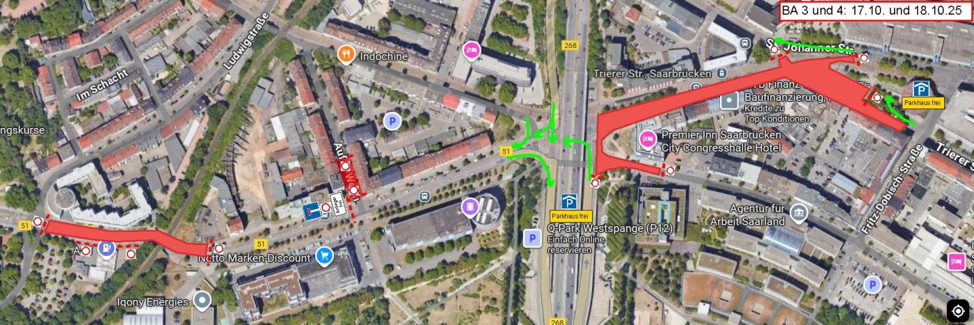- Sperrung der St. Johanner Straße ab Hausnummer 49 (neuer Kreisel) bis Hausnummer 37 sowie Sperrung des Knotenpunkts St. Johanner Straße/Trierer Straße.